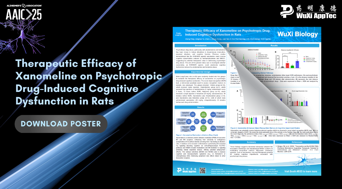 Psychotropic drug abuse, particularly involving amphetamines and ketamine, has been shown to induce alterations in dopaminergic innervation, neuronal structure, and cognitive function. For AAIC 2025, WuXi Biology showcased a poster on a study that investigated whether xanomeline, an M1/M4 muscarinic receptor agonist, could ameliorate cognitive dysfunction induced by amphetamine and ketamine abuse.