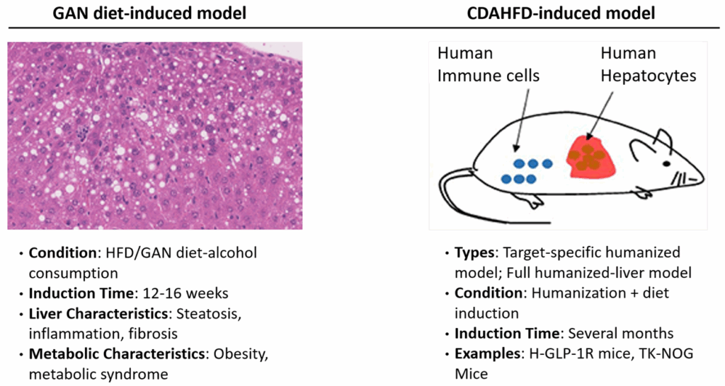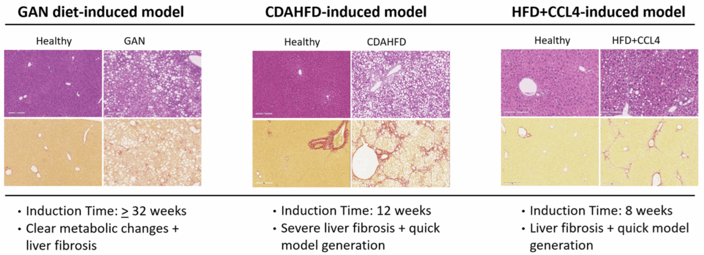 | Steatosis/ Steatohepatitis | — HFD-induced mouse MASLD model — HFD+CCl4-induced mouse MASH model — CDHFD-induced Rat/mouse MASH model — GAN Diet-induced mouse MASH model — STZ+HFD-induced mouse MASH model — MCD-induced mouse MASH model — Western diet-induced mouse MASH model — HFD+fruc/gluc in drinking water-induced mouse MASH model — CDAA diet-induced mouse MASH model — Ethanol liquid diet-induced rat/mouse ASH/ALD model — Diet and ethanol-induced MetALD model |