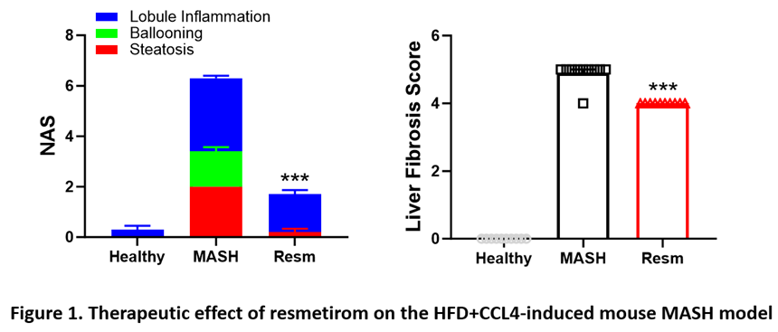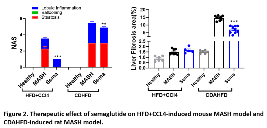 We developed two key MASH models in rodents: the high-fat diet (HFD)+CCL4-induced model and the CDAHFD-induced model. Additionally, we verified the therapeutic effects of two clinically approved MASH drugs, resmetirom and semaglutide, on these models. Our models accurately simulated the development of MASH and the therapeutic impact of these drugs in humans (Figures 1 and 2, below).