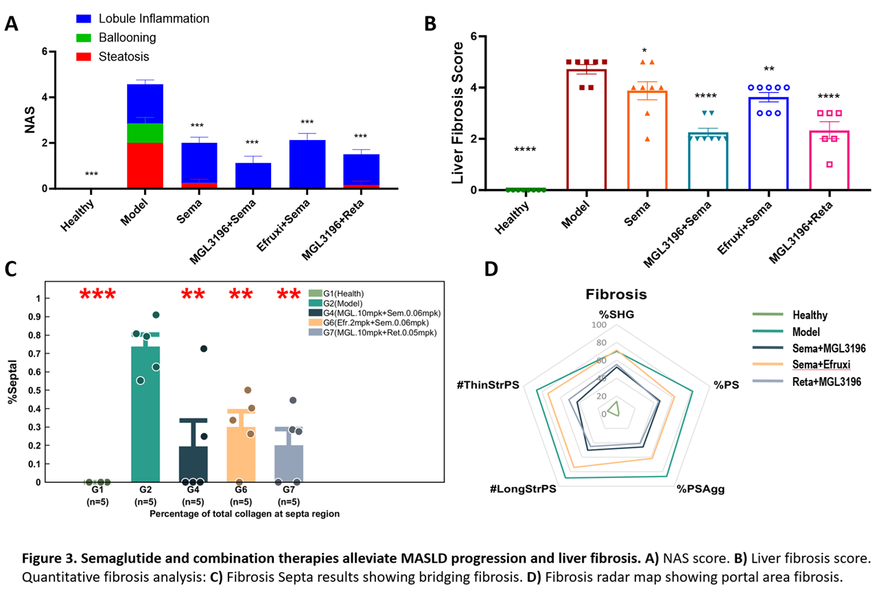 We evaluated the efficacy of GLP-1 receptor agonists, in combination with other therapeutic agents, such as MGL3196 (also know as Resmetirom) and efruxifermin, in an HFD plus CCl4-induced mouse MASH model (Figure 3, below). While all treatments significantly reduced NAFLD activity score (NAS) and liver fibrosis scores. GLP1Rs+MGL3196 combinations showed the most substantial improvements, especially for fibrosis around the portal tract.