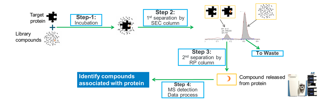 Unlike DNA-encoded libraries (DELs) that require compounds to be physically attached to DNA sequences, ASMS is a label-free method compatible with any drug-like compound library. The ASMS workflow utilizes a size-exclusion chromatography (SEC) column for the initial separation of protein-bound complexes, followed by a reverse-phase (RP) column to release and identify the specific binders via high-resolution mass spectrometry (Figure 1) [1,2].