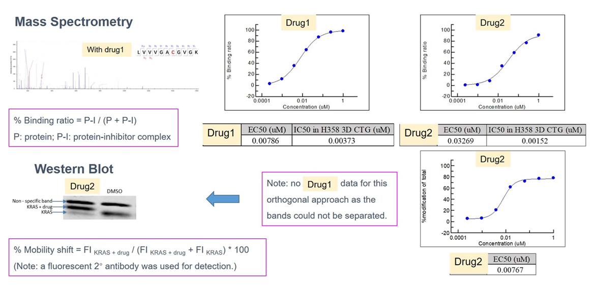 Figure 2. In-cell covalent drug screening. Mass spectrometry confirms a nearly 100% binding ratio. Dose-response curves show highly potent inhibitors with EC50 ~10nM.