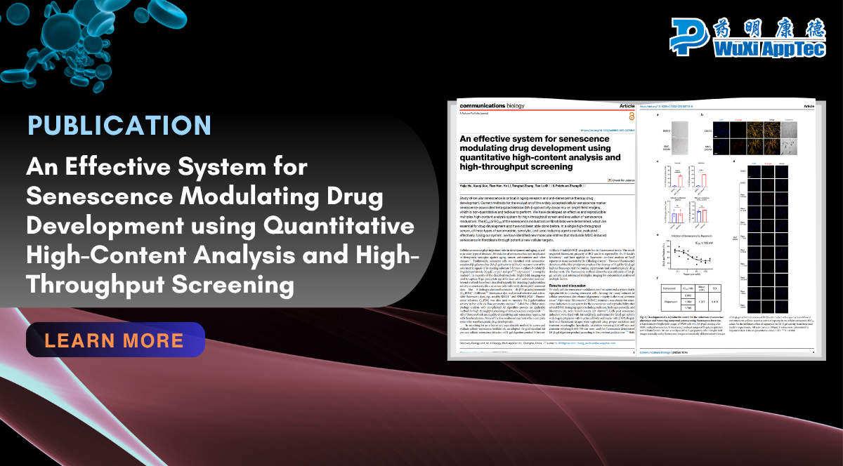 In this publication, WuXi AppTec scientists describe the development of an effective and reproducible multiplex high-content analysis system for high-throughput screening and evaluation of senescence modulators. In a single high-throughput screen, the authors show that all three types of senomorphic, senolytic, and seno-inducing agents can be evaluated effectively, in a quantitative manner.
