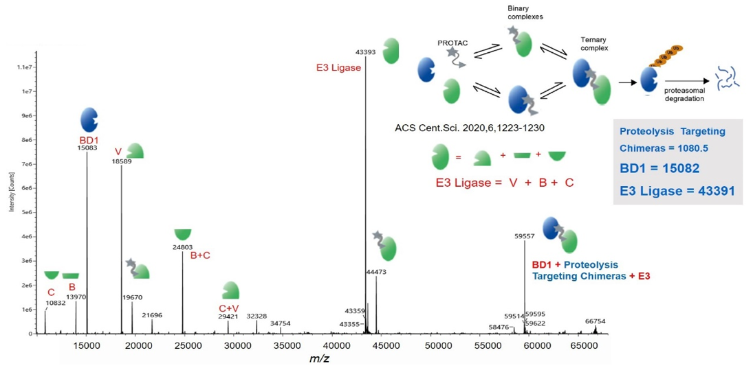 Following synthesis, the efficacy of PROTACs to bind specifically with the target protein and E3 ubiquitin ligase becomes a vital concern. Since the ternary complex is non-covalently bound, the binding strength is relatively weak and can be easily disrupted using denatured mass spectrometry methods, making the detection of the complex’s ion peak impossible. Native mass spectrometry presents a solution to this issue. It can identify the ternary complex without disrupting the non-covalent interactions within the molecules. The detection of a peak at 59557 in the mass spectrum (Figure 7) signifies the existence of the ternary complex.