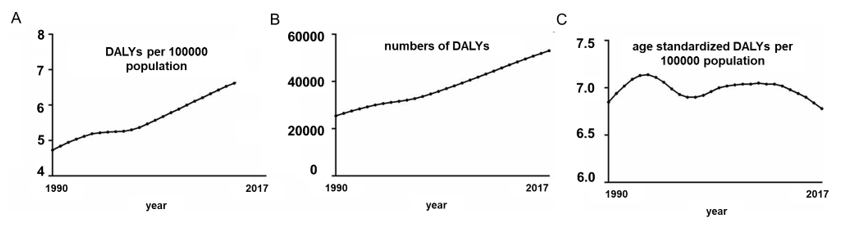 Figure 2. Changes in global burden of Age-related Macular Degeneration (AMD) in terms of disability-adjusted life years (DALY) numbers (A), DALY rates (B), and age-standardized DALY rates (C) between 1990 and 2017. Lines represent 95% uncertainty intervals [2]