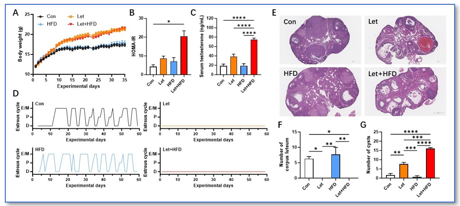 Figure 2. Mouse PCOS Model Induced by Letrozole combined with HFD (Source: Internal data from WuXi Biology) A. Body weight changes; B. Insulin resistance index; C. Serum testosterone levels; D. Estrous cycle; E. Ovarian histopathology; F. Corpus luteum counting; G. Ovarian polycysts counting.