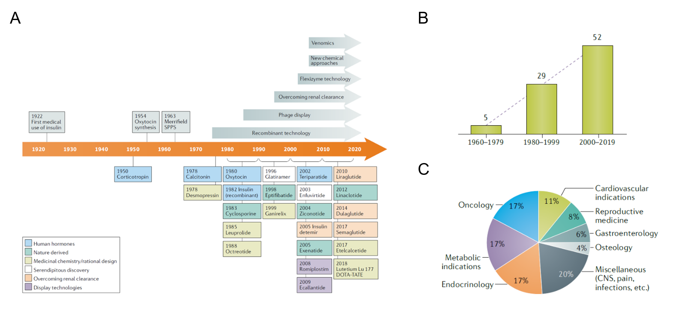 Figure 1. Historical timeline of key milestones, developments, and drug approvals in the peptide therapeutics field [1].