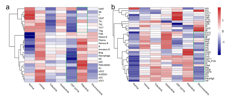 To further comprehend how JAK inhibitors affect the immune system and its potential mechanism of action in RA treatment, WuXi Biology utilized flow cytometry to identify and count T cells, B cells, and myeloid cells in the spleen and their subsets. We analyzed 34 cytokines in plasma using Olink® technology and performed a hierarchical cluster analysis of the results. Compared with the control group, non-selective JAKi, JAK2, JAK3, and TYK2 inhibitors effectively inhibited the differentiation and proliferation of T cells. Non-selective JAKi, JAK1, and JAK2 inhibitors effectively inhibited the differentiation and proliferation of B cells, while non-selective JAKi, JAK1, JAK2, and TYK2 inhibitors resulted in a decrease in the number of myeloid cells (Figure 4a). TYK2 inhibitors significantly inhibit the expression of inflammatory cytokines (Figure 4b).