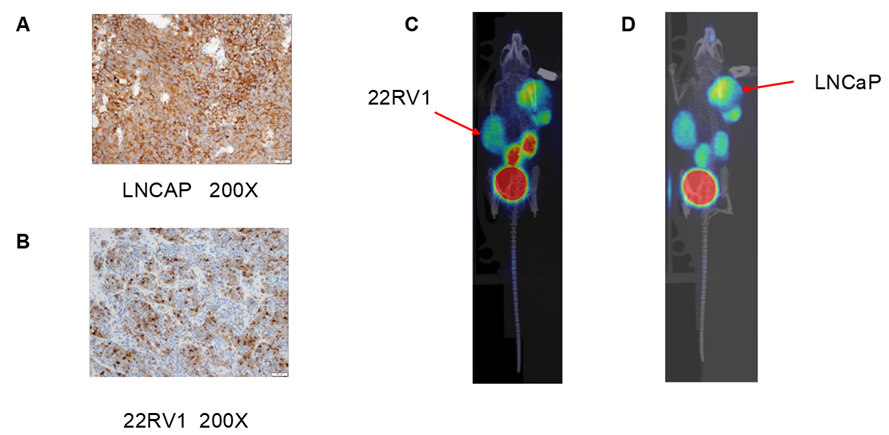 Figure 5. PET imaging of 68Ga‑RDC in a dual‑tumor model. A & B. PSMA IHC staining of LNCaP and 22RV1 tumor tissues. C & D. PET images of 68Ga‑RDC in the dual‑tumor model