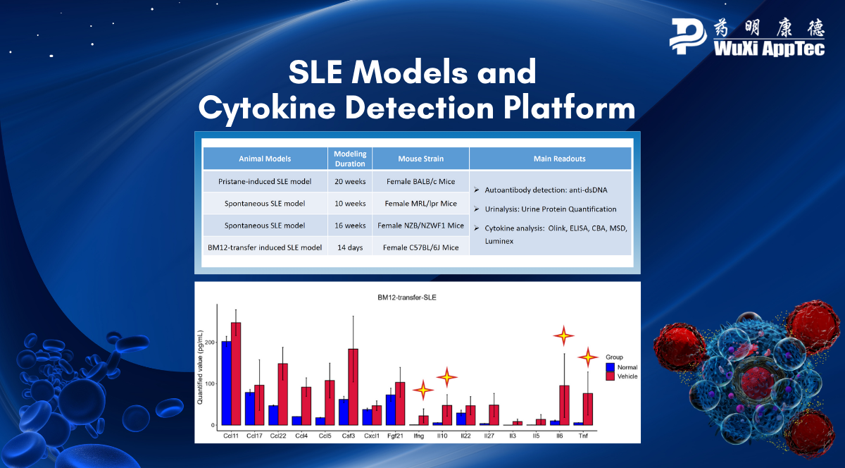 A key characteristic of SLE is the production of IgG autoantibodies, and a hallmark of the disease is the elevated presence of antibodies targeting nuclear components. To accelerate the development of effective treatments for SLE, WuXi Biology has established a series of animal models and a cytokine detection platform, empowering immune response assessments with accuracy, depth, and speed.