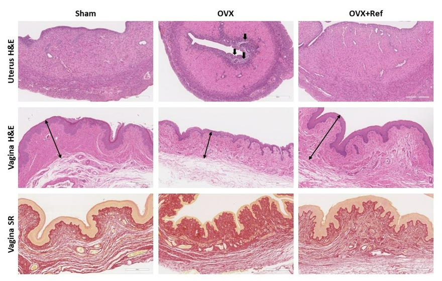 Histopathological staining of the uterus and vaginal tissues indicated increased inflammatory infiltration and edema, as well as typical symptoms of atrophic vaginitis, such as thinning and fibrosis of the vaginal epithelium and lamina propria, in OVX rats (Figure 4). With continuous estrogen supplementation (Ref in Figure 2-4) after ovariectomy, the team found significant improvements in the profiles of weight gain, reproductive organ lesions, disappearance of the estrous cycle, and bone density reduction in these animals (Figure 2-4). These data confirm that this model can reproduce relevant clinical manifestations of menopausal syndrome and is an effective model for evaluating related drug therapies.